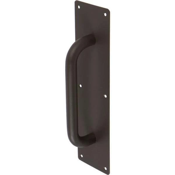 Bold combined with beauty, the Delaney Hardware Round Barn Door Handle with plate measures 11-3/4 in. H. Its quality feel and look was designed for any door in your home. Specifications: Grip Center-to-Center: 8 in. Length: 10.25 in. Material: Steel Product Weight: 3 lbs. Projection: 2.5 in. Easy to install and the bronze finish compliments any rustic style door.