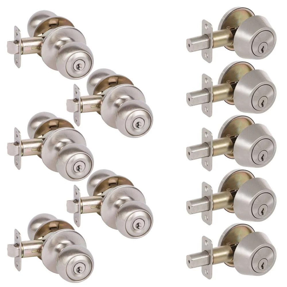 5 Callan Fairfield round style satin nickel entry knob door locks and 5 Callan satin nickel single cylinder deadbolts in 1 project pack. All 10 locks operate with the same key. The knobs and deadbolts operate with a thumb turn on the inside of the door and are opened from the outside with the same key. The inside thumb turns need to be rotated to lock the door which prevents unwanted lockouts. Ideal for new construction or remodeling projects where multiple doors need to operate on the same key system.