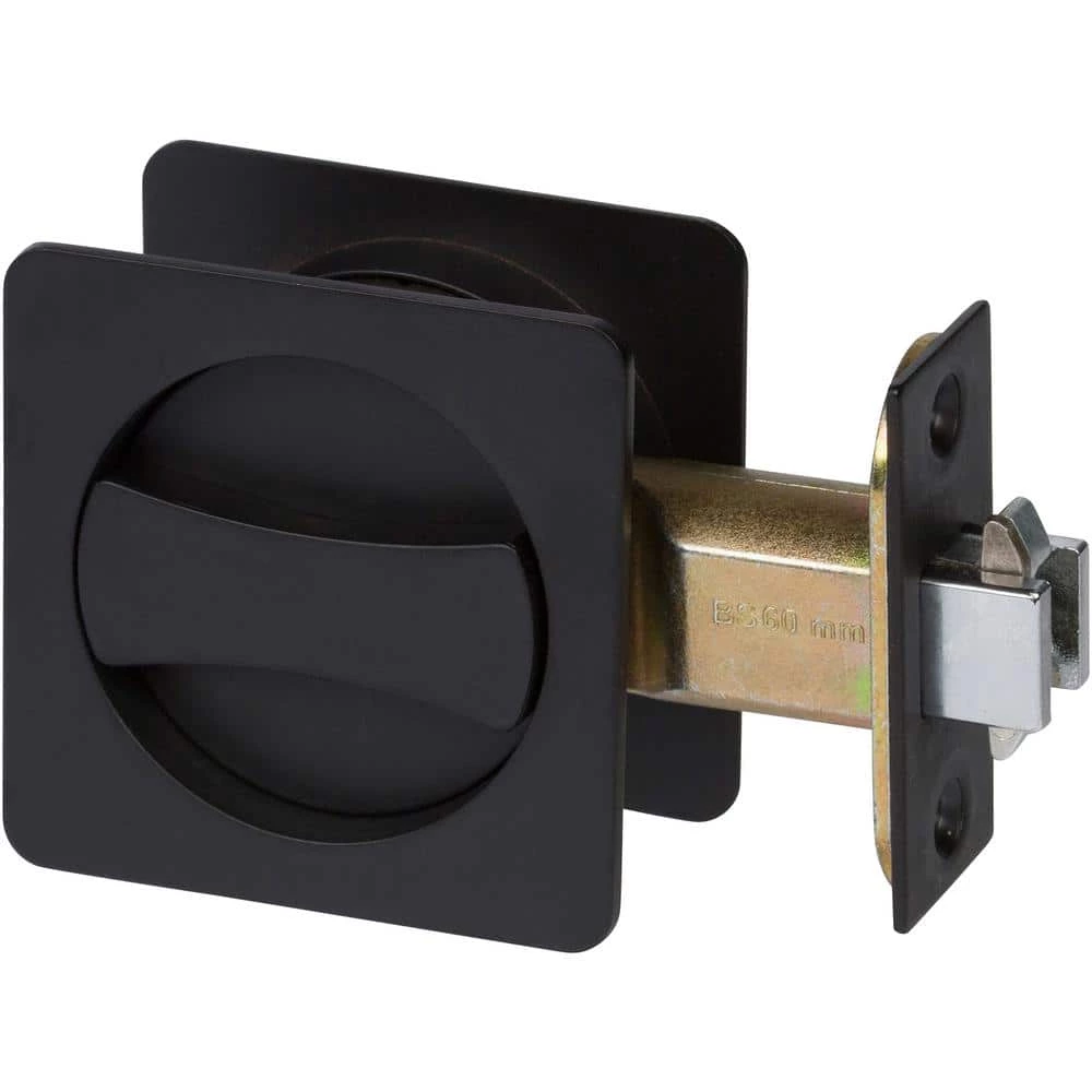 Delaney black rounded corner comtemporary square privacy pocket door lock. Simple, versatile design that compliments all interior styles. Includes edge pull for easy access when door is completely recessed in the channel. Privacy function includes a color coded indicator for locked and unlocked positions. Flush mount.