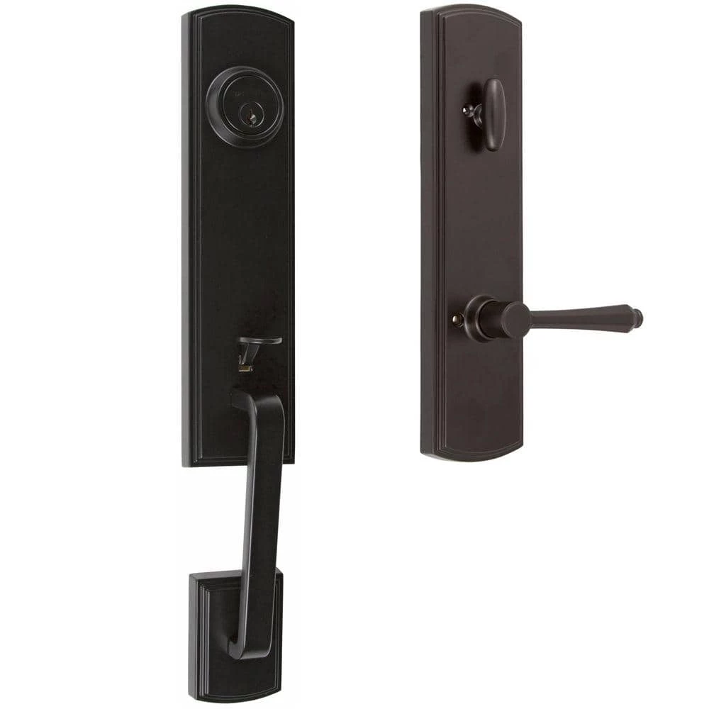 The Delaney Designer Series Italian Collection was inspired by the simple elegance of Venice and the timeless appearance found in Tuscany. The Briona with exquisite straight lines and enlarged back plate adds style and value to any home. The black finish complements a wide selection of interior design options. The upper trim is a single cylinder deadbolt which is operated with a key on the outside and a thumb turn on the inside. The inside lower trim is a Florini lever for a left hand door (LH). Handing is determined by standing on the outside of the door noting on which side the hinges are located hinges on the right side is a RH door, hinges on the left side is a LH door.