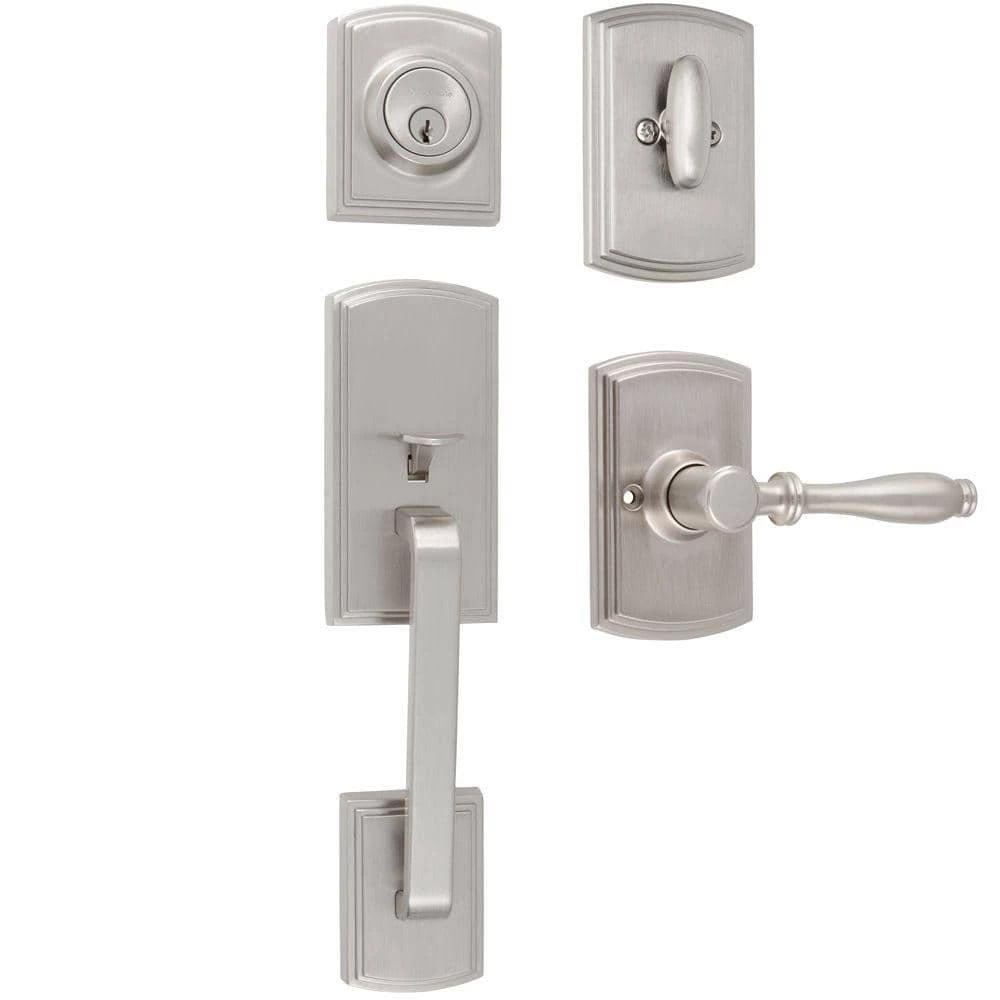 The Delaney Designer Series Italian Collection was inspired by the simple elegance of Venice and the timeless appearance found in Tuscany. The Visconti entrance handleset with exquisite straight lines and enlarged back plate adds style and value to any home. The satin nickel finish complements a wide selection of interior design options. The upper trim is a single cylinder deadbolt which is operated with a key on the outside and a thumb turn on the inside. The lower trim is a Sorado lever for either a left hand door (LH) or right hand (RH) door. Handing is determined by standing on the outside of the door noting on which side the hinges are located hinges on the right side is a RH door, hinges on the left side is a LH door.