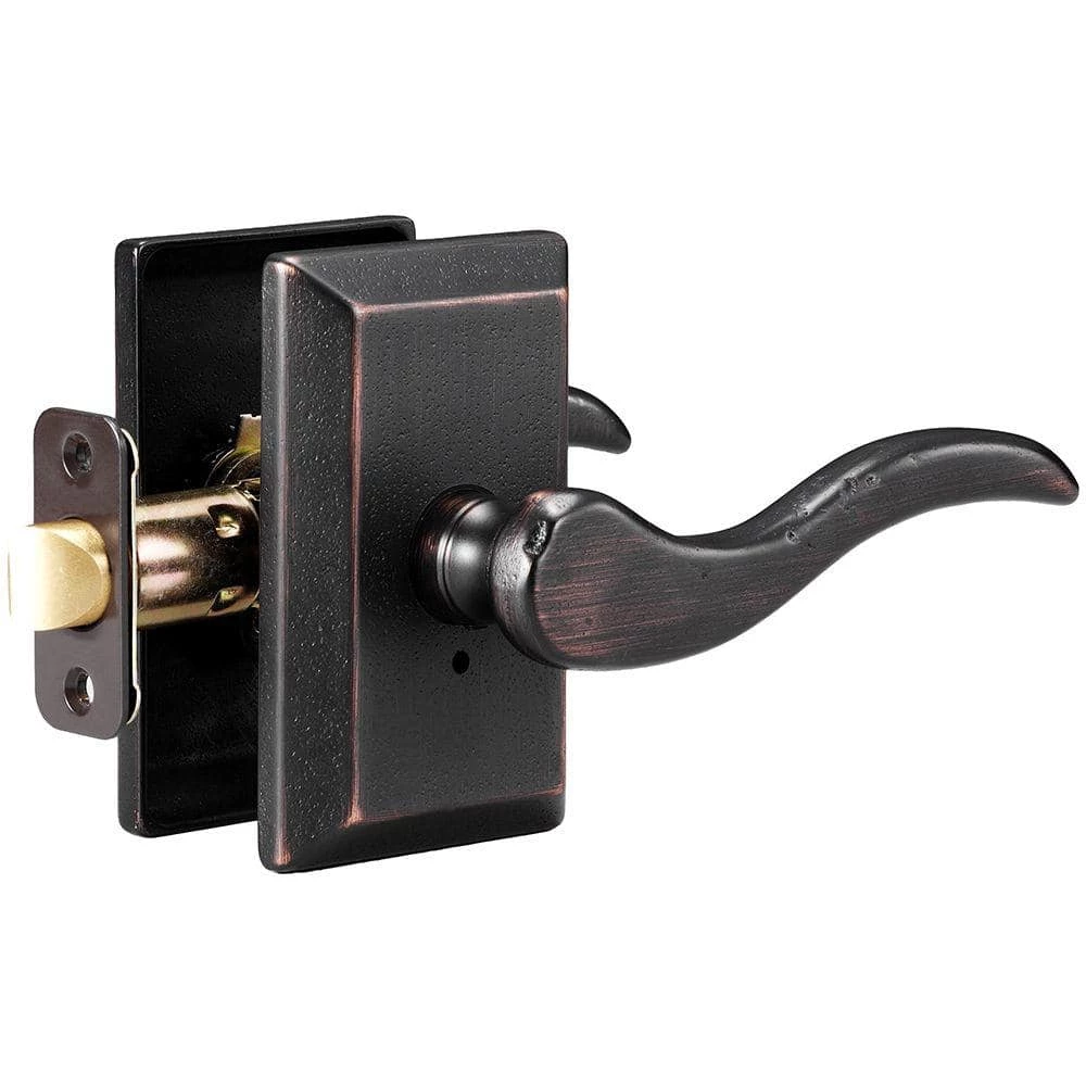 The Delaney Sandcast Collection is an affordable rustic design that enhances any door with a bold statement. The Rhonda Aged Bronze privacy right hand wave style door lever a square backplate is designed for use on any bedroom or bathroom door that needs to be locked with a thumb turn on the inside and can be opened with an emergency release pin on the outside included with the lock. Store the emergency release pin on the trim above the door on the outside for quick retrieval. Vintage solid construction will exceed your expectations offering heavy, durable workmanship with high quality details. Ideal for new construction or remodeling.