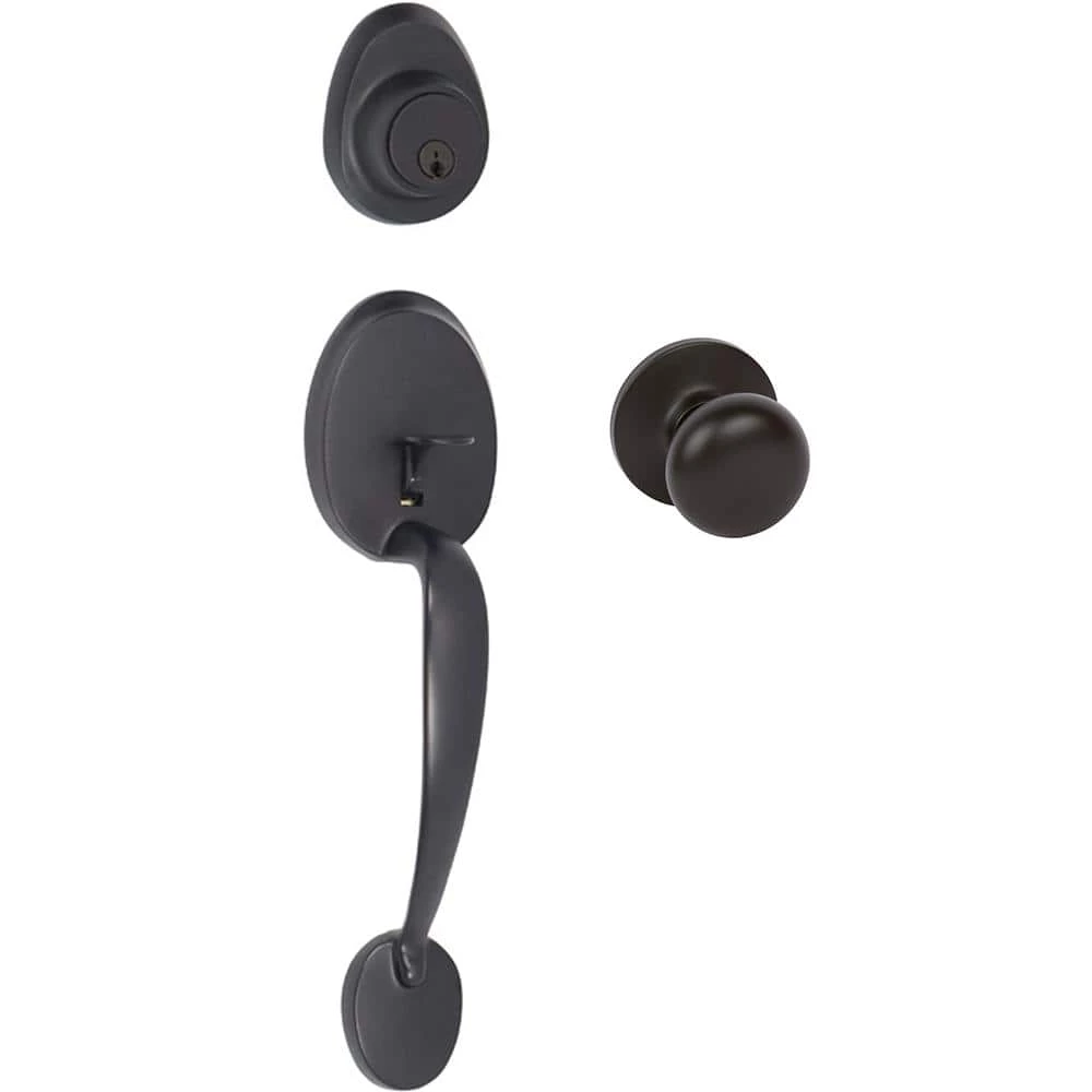 Traditional, classic and modern. The Delaney Tralee black entry door handle set combines classic clean lines with a precision oval characteristic for timeless final touch to a wide variety of home designs. The upper trim is a single cylinder deadbolt which can be locked or unlocked with a key on the outside or with the thumb turn on the inside. Meets egress codes. The inside lower trim is a matching black finish universal round knob that works on right hand or left hand swing doors. Split trim design accommodates installations for either new construction or replacement/remodeling.