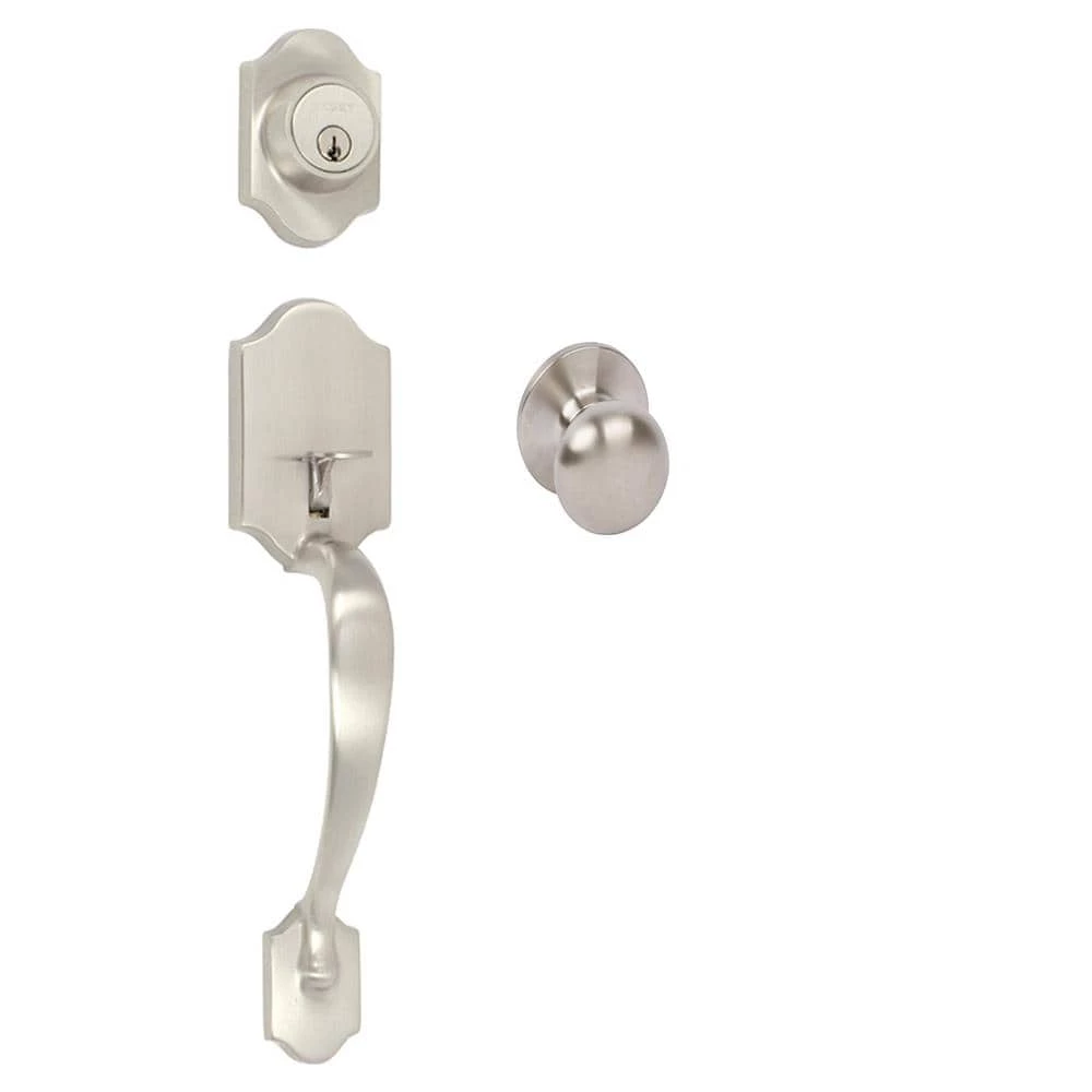 Traditional style sating nickel entry door handle set. The Delaney Wicklow style lock combines traditional curves with modern age finishes and quality for a look that complements a wide range of home styles. The upper trim is a single cylinder deadbolt which can be locked or unlocked with a key on the outside or with the thumb turn on the inside. Meets egress codes. The inside lower trim is a matching satin nickel finish universal round knob that works on right hand or left hand swing doors. Split trim design accommodates installations for either new construction or replacement/remodeling.