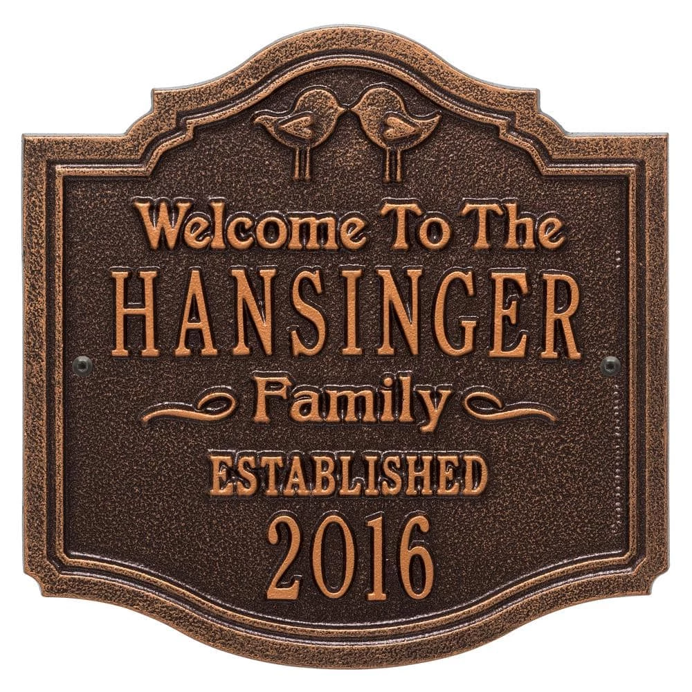 The unique shape and border design, along with the folksy kissing birds ornament, give this anniversary plaque its charming look. A Personalized plaque is a perfect gift to commemorate all of life’s celebrations. Handcrafted aluminum plaque for indoor or outdoor use. Makes a great personalized wedding, anniversary or house warming gift.