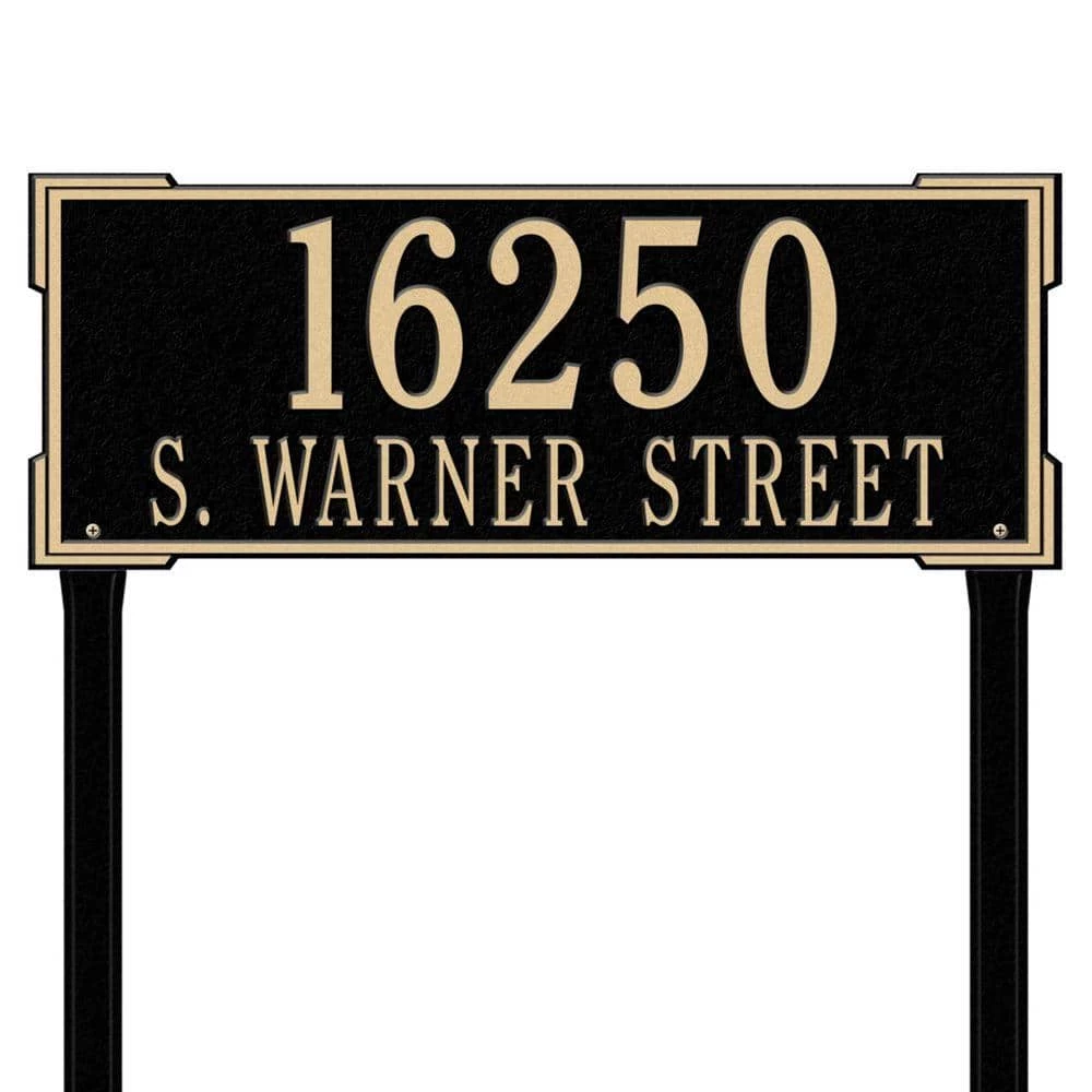 - 2 line plaque: line 1 holds up to five 4.5 in. numbers; line 2 holds up to seventeen 2 in. characters