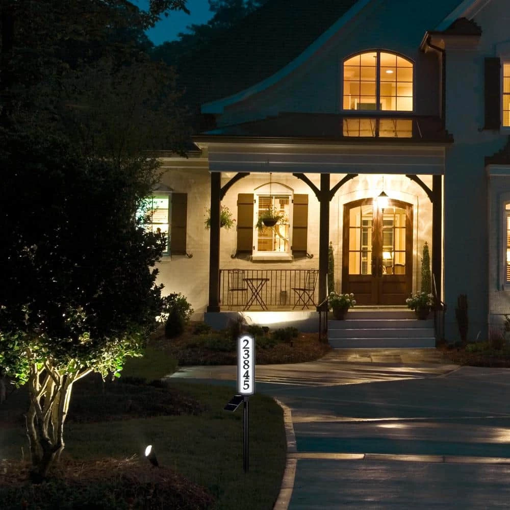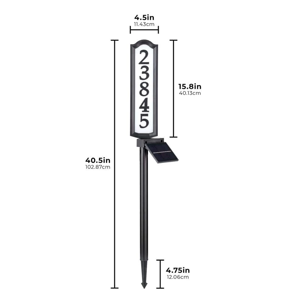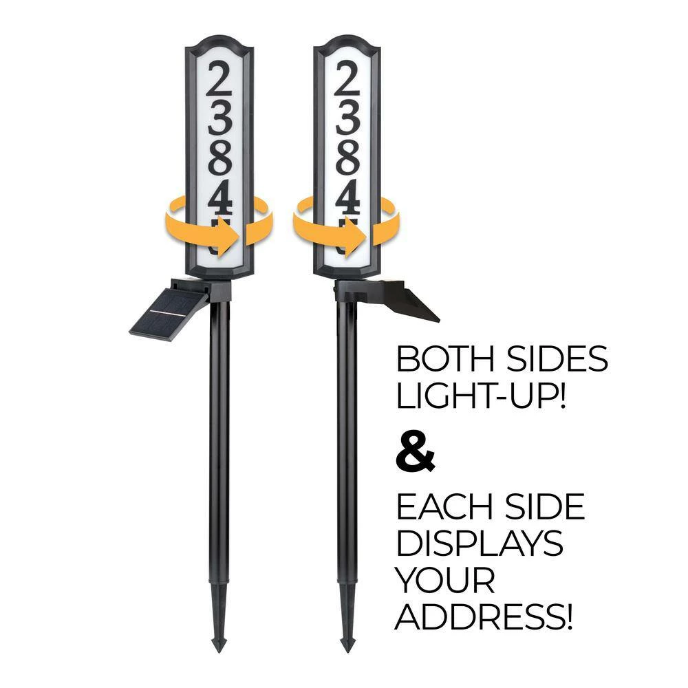 Increase your address visibility while reducing your carbon footprint with the SolarSOLutions Aurora Solar LED Address Post. Fully charged in just 10-hours, this address sign lasts up to 5-days without sunlight. The double-sided address sign adjusts 360° for the perfect street view. Easily adjust the direction and angle of the solar panel for optimum sun exposure. Holds up to 5 address numbers on each side of the sign. Easy to assemble and install. Battery included.